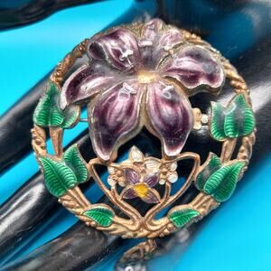 *Description: This is a vintage purple flower and green leaves of enamel on a copper background. The brooch is designed with open work so that your background of your outfit shows through. This would be a great addition to your jewelry collection or make a great gift!