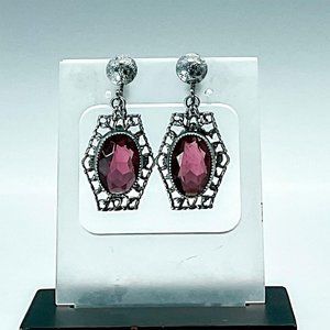 Vintage Purple Gemstone Earrings, Silver Tone Filigree Design, Screw Back