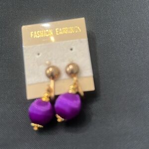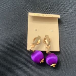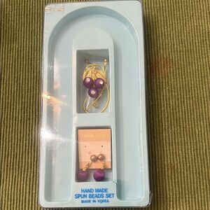 Elegant handmade jewelry set featuring purple and gold spun beads. Includes a brooch and matching clip earrings