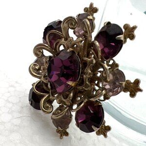 Elegant vintage brooch featuring purple rhinestones and intricate gold-tone detailing. Ideal as a statement accessory or collection piece.