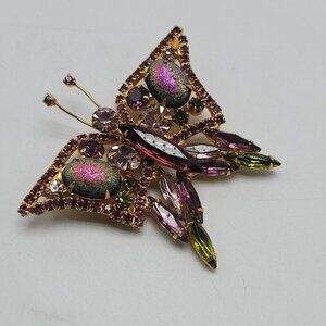 This exquisite vintage brooch showcases a butterfly design adorned with multicolored rhinestones and faux opals. Its radiant colors and intricate detailing make it a standout piece in any jewelry collection, offering a touch of elegance and sophistication.