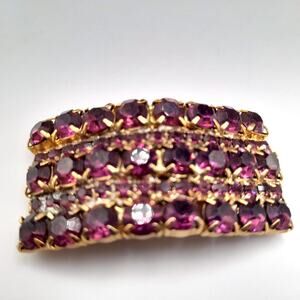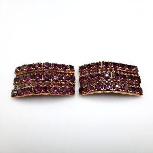 *Description: This is a beautiful pair of mid-century purple shoe clips with prong set purple rhinestones on a gold plated backing. The gold clip is on the back. This would be a great addition to your vintage jewelry collection or make a great vintage gift!
