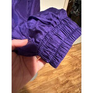 This vintage silk bomber jacket by Fuda International is a true retro gem. Crafted from 100% silk in a stunning shade of purple, the jacket features a quilted-look upper adorned with gold-tone beads for a bold and unique style. The relaxed fit, elastic cuffs, and waistband give it the classic bomber silhouette, making it perfect for vintage streetwear lovers or anyone seeking a standout piece. Rare color!