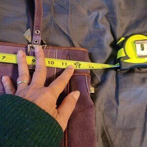 Purple vintage suede coach purse with leather trim and silver hardware; zippered closure; see photos for dimensions; in good used condition with some small wear (see photos); inside lining has 2 small pockets and one larger zipped pocket; still has coach key chain tag; adjustable straps