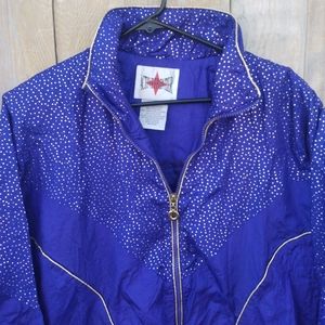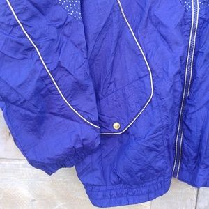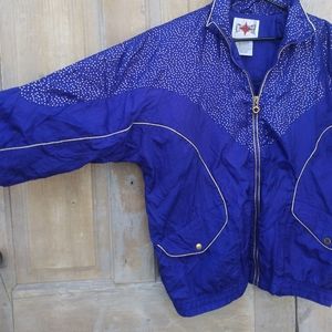 Vintage Purple and Gold Nylon Windbreaker from Active Frontier. Amazing Nylon Jacket with tons of detail. Shimmery Gold Polka Dot pattern on the upper portion. Gold piping. Gold tone circular zipper pull. Large front flap pockets with snap closure. Elastic waist. Oversized fit. Shoulder pads attached under the lining. Fully lined. Made in Russia..