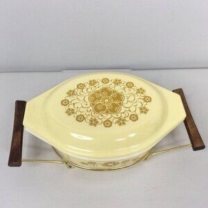 Vintage Pyrex Kim Chee 043 Covered Casserole Dish with Metal & Wood Handle Cradle Stand - 1 1/5 Qt