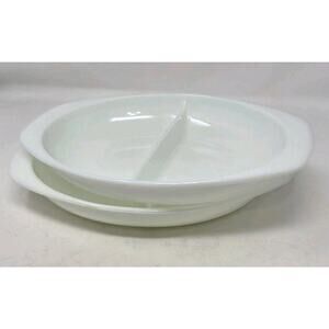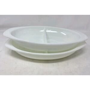 Lot of 2 divided milk glass pyrex casserole dishes.