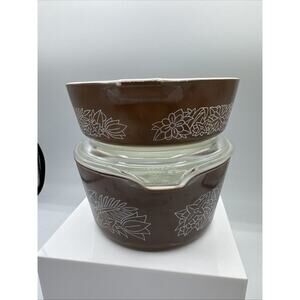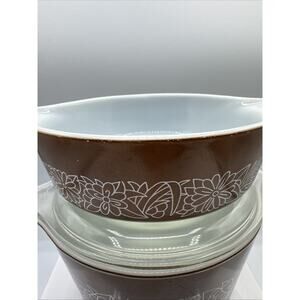 Add a touch of retro to your kitchen with this vintage Pyrex casserole set. The set includes two round dishes, with a total of two compartments, and one lid. The brown-colored glass material and woodland pattern make it a great addition to any decorative cookware collection. These dishes are oven-safe and perfect for baking or serving your favorite dishes. The original Pyrex brand and milk glass production style add to its uniqueness. This set is a great find for any collector or lover of American-style vintage cookware.