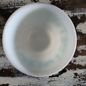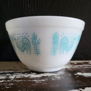 This Pyrex mixing bowl showcases the classic Amish Butterprint design in white and aqua. Functional and collectible, ideal for both use and display.