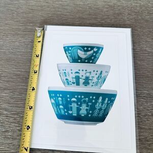 Greeting card with blue and white Pyrex mixing bowls or dishes graphic photo cover. Blank inside.
