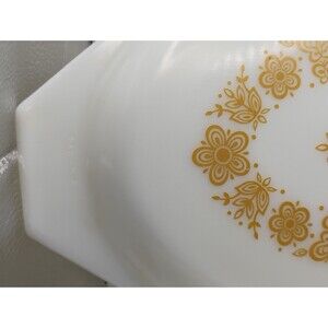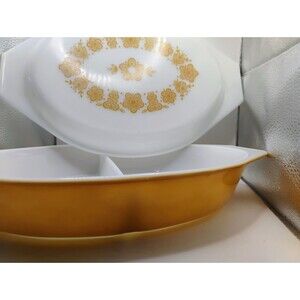 The Vintage Pyrex Butterfly Gold 1-1/2 Qt Oval Casserole Covered Dish # 043 from the 1970s is a charming piece of mid-century modern decor. Made of milk glass with a beautiful gold color and adorned with a butterfly theme, this casserole dish exudes a retro vibe. The Pyrex brand ensures high quality and durability, making it a practical and stylish addition to any kitchen or dining collection.