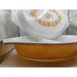 Vintage Pyrex Butterfly Gold 1-1/2 Qt Oval Casserole Covered Dish # 043 - 70s