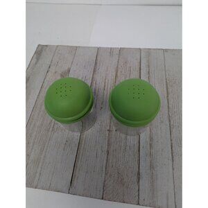Vintage Pyrex Corning Glass Plastic Mushroom Salt & Pepper Shaker Set Green Tops