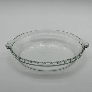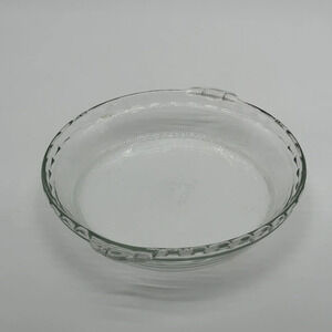 This vintage Pyrex deep dish pie plate is a classic addition to any kitchen. Made in the United States, this piece features a fluted rim and tab handles for easy transportation. The clear glass pressed glass material gives it a timeless look that is perfect for all occasions.