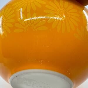 This vintage Pyrex Daisy pattern Cinderella mixing bowl set includes three pieces. With their vibrant yellow and orange floral design, these bowls are perfect for both kitchenware and serveware, offering a charming retro aesthetic while being functional for mixing, serving, or display.