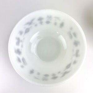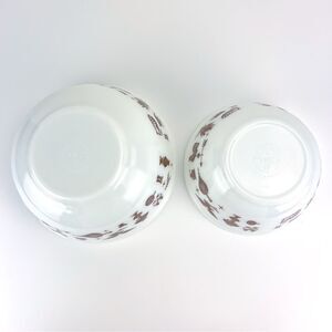 Pyrex Early American white/brown nesting mixing bowls w/rooster-eagle pattern.