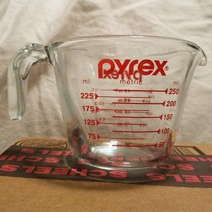 Vintage Pyrex Glass Measuring Cup. 1 Cup 8 oz. Metric 250 ml. L-Handle Style. Red Letters. #27