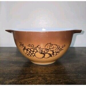 Add a touch of vintage charm to your kitchen with this beautiful Old Orchard Brown Pattern #441 Mixing Bowl by Pyrex. Made of high-quality milk glass, this 1.5 pint bowl features a stunning brown color and a fruit-themed design that will make it a great addition to your Mid-Century Modern collection.