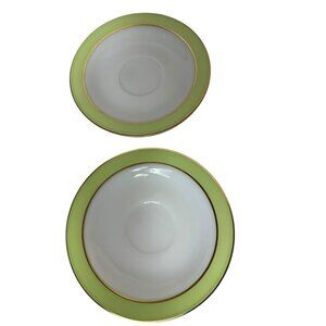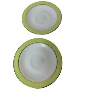 This vintage Pyrex includes four saucers each featuring a classic green and gold rim design. These saucers are an elegant addition to any dining collection, showcasing timeless craftsmanship from Pyrex, made in the USA.