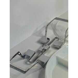 Vintage Pyrex oval divided casserole dish with snowflake pattern. Comes with lid and metal serving carrier, perfect for holiday meals or vintage kitchen display.