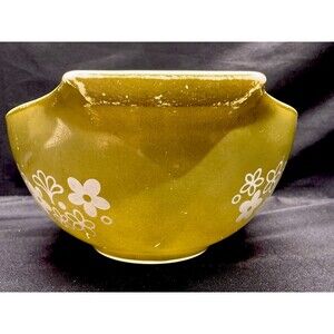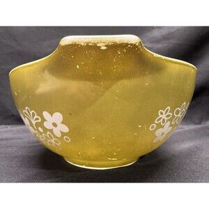 The Vintage Pyrex Spring Blossom Round Cinderella Mixing Bowl 442 in 1 1/2 Qt size is a decorative piece of cookware from America, manufactured in 1972. This glossy green bowl with a spring blossom pattern features a mid-century modern style and is made of milkglass. With a round shape and a decorative theme of flowers, this original Pyrex bowl is perfect for all occasions and should be hand washed for maintenance. The 9.25" length and 7.5" diameter make it a charming addition to any kitchen collection. Please note- this is pre-owned and has lots of signs of wear. There is lots of scratching, as well as spots with no green finish, especially near handled. There is some staining as well as grey lines/scratches. Aside from that its still a solid Pyrex! No chips or cracks. Please make sure to look at pics closely. Thanks for looking!