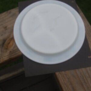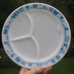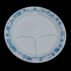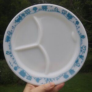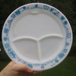 Vintage Pyrex Tableware By Corning Child's Divided Plate Blue Train. Number on back appears to read 791-6 last picture for a closeup. Flaws there seems to be some dark marks on the back see last 2 pictures for a closeup . These spots did not come off with a gentle cleaning . Plate measures ~ 9.5 " diameter tape measure in pictures above , questions are always welcome . Good used vintage condition some scratches utensil marks visible in the right light and better eyesight than me . Cute playful plate for a child. I bought it as a joke for an adult who does not like their food touching when they eat at my house LOL .. The look on his face when I served his dinner on it was priceless.