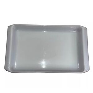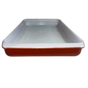 Add a pop of mid-century charm to your kitchen with this vintage Pyrex rectangular baking dish, model #18. Featuring a vibrant terra cotta orange exterior and a classic white interior, this hard-to-find piece measures 15.5” x 8.75” x 1.75” and holds approximately 3 quarts. Marked on the base with “Pyrex Made in USA” and original dimensions, it’s perfect for both display and daily use.
