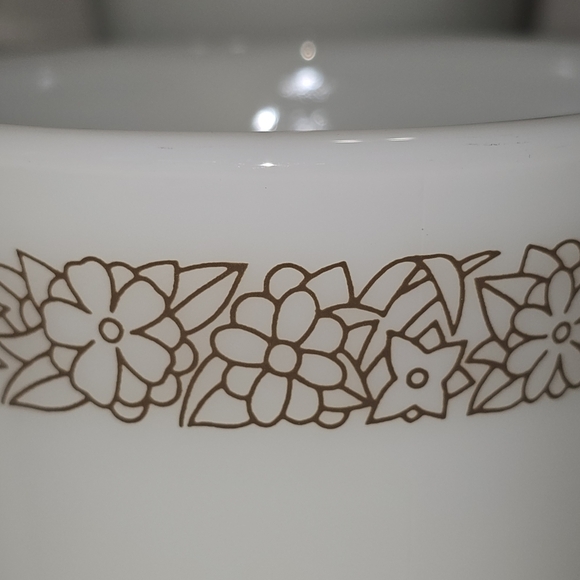 Charming Pyrex mugs featuring a brown floral band. Ideal for cozy gatherings.