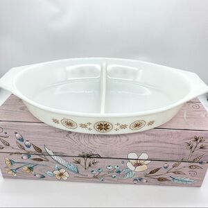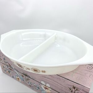 Vintage Pyrex Town and County Divided Casserole Dish 1 1/2 Quarts All Brown Design 1963-2967 Made in the USA. In good condition, no chips or cracks.