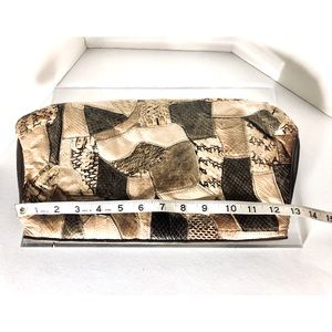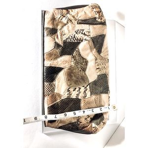 Snakeskin patchwork on front & back! Minor stains on back side. Clean interior. Good overall vintage condition.