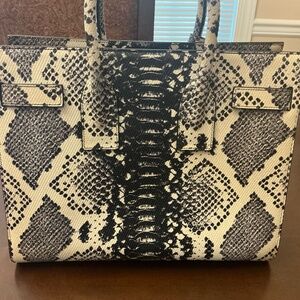 This sophisticated and elegant St Laurent python bag is in excellent like new condition. I only carried the bag a few times and it has been stored in a dustbag. There are no signs of wear on the exterior or interior. The interior features sleek black leather with two zipper pockets and two slip pockets. The bag features double rolled handles, a detachable strap, and a hanging covered padlock. Metal feet protect the bottom of the bag and the hardware is silver.