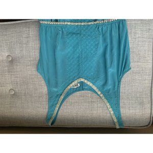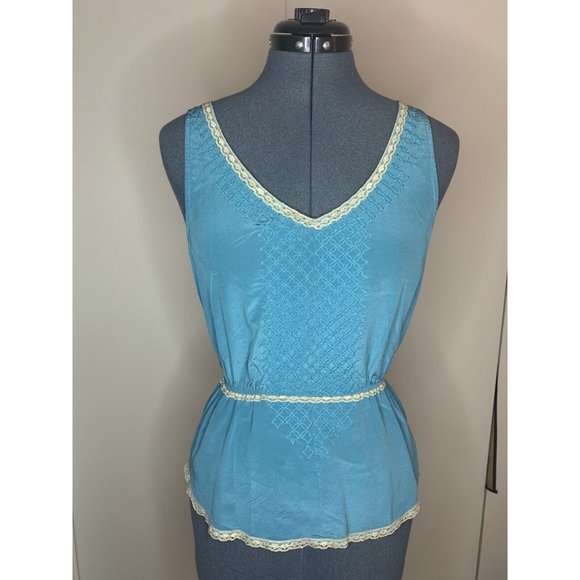 Very cute unique silk tank/ shell by Quick Silver. Vintage top is a peacock/ turquoise blue with contrasting gray lace and gray little buttons in the back. Tank sinches in at the sides for the peplum and ruffle. There is embroidery in the front in the same color of the tank - a repetitive pattern.