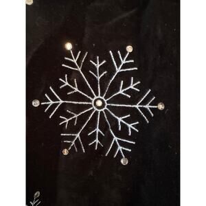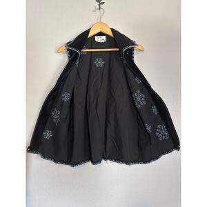 VTG QVC The Quacker Factory black velvet holiday women's full zip up collared vest. Embroidered snowflakes with sequin on front and back. Embroidery along collar, sleeves and hem. PLEASE READ - fabric, care, materials, size tag cut off, see measurements, otherwise great preowned condition. Professional, highly rated seller, quick shipper, open to offers! Multiple vintage items available, bundle to save!