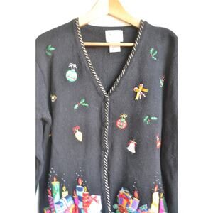 Festive and full of nostalgia, this vintage Quacker Factory Christmas cardigan features charming embroidered holiday scenes with Santa, Mrs. Claus, presents, poinsettias, and ornaments. Crafted in a cozy ramie-cotton blend, this piece perfectly captures the cheerful spirit of 90s holiday sweaters.