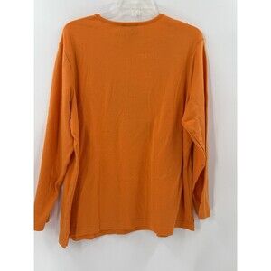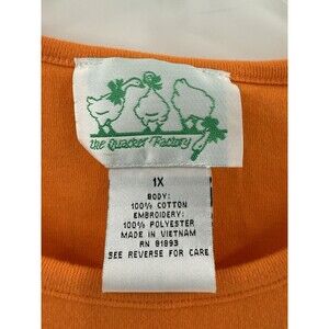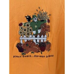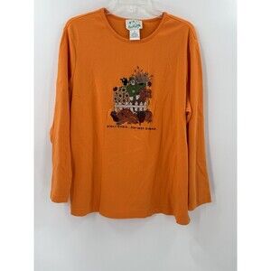 This Vintage Quacker Factory Fall Scarecrow Long Sleeve Tee Shirt in Plus Size 1X is a delightful addition to any woman's wardrobe, perfect for the fall season. The tee shirt features a classic round neckline, pullover closure, and is made from lightweight 100% cotton knit fabric. It is adorned with beaded and embroidered accents, including a charming scarecrow and pumpkin design, making it ideal for casual occasions. The orange color and fall-themed pattern add to the vintage appeal of this basic yet stylish t-shirt from Quacker Factory. Easy to care for with machine washable instructions, this tee is a must-have for any Autumn wardrobe.