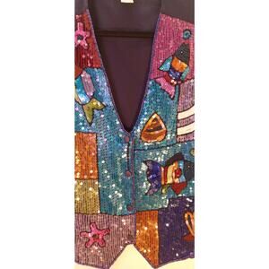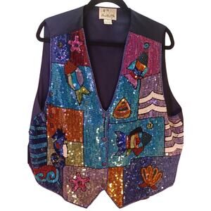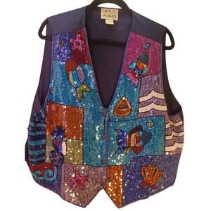 Vintage Quacker Factory Sequin Vest 1X Nautical Fish Theme Blue and Purple-Note there are a couple of areas on the vest where the sequins are missing but it is not very noticeable- See Photos.