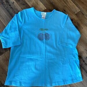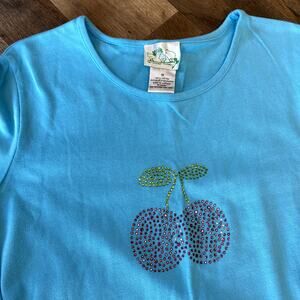 Vintage Quacker Factory Women's Blue 3/4 Sleeve Rhinestone Cherries Top 1X