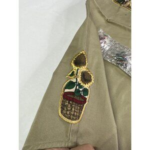 This charming vintage Quacker Factory shirt features whimsical embroidered gardening angels surrounded by sunflowers and stars. The cotton fabric offers a comfortable fit while the intricate embroidery adds a unique touch. Ideal for collectors or those who appreciate vintage fashion, this piece combines artistry with comfort.