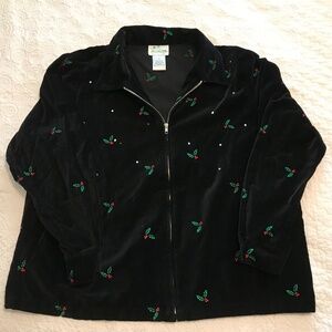 Blingy vintage Quacker Factory black velvety long-sleeved zip-up holiday jacket embellished with embroidered holly leaves and berries and clear rhinestones. Rhinestones only on the front, embroidery all over the garment. Jacket is unlined. Opalescent buttons on sleeves. Size 1X. Measurements, materials and care instructions in pictures. Gently worn, but in excellent shape. Perfect for the holiday season! ๐๐๐