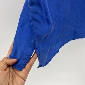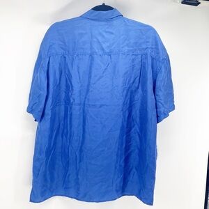 Vintage Quarters 100% Silk Short Sleeve Button Down Shirt blue hi lo split hem