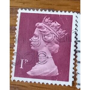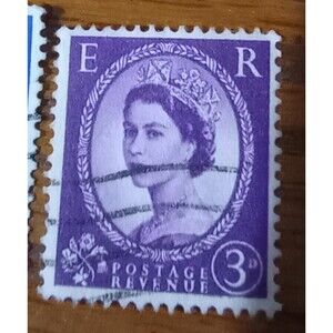 Trio of postage stamps featuring the late Queen Elizabeth II. Blue profile stamp circa 1970s; maroon profile stamp circa 1960s; ER stamp circa mid-1950s. All stamps show postage marks. Residue on back from removal. Good condition.