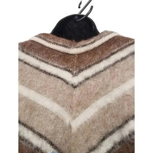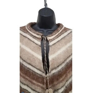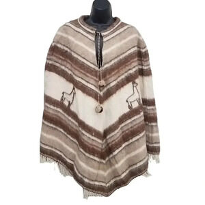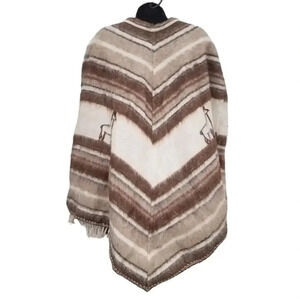 Alpaca/Merino Wool Blend, Sweater Cape/Poncho, Slight V Neck with Tie, V Hem with Fringe, Cream/Beige/Brown Mix Design with Alpaca Print, sz 3 - Made in Argentina