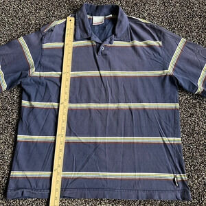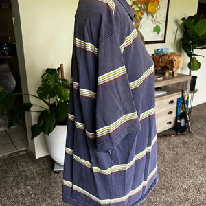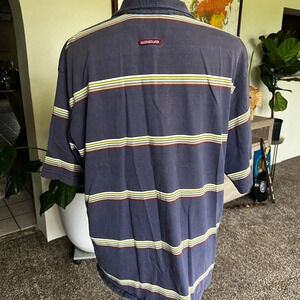 Vintage Quicksilver polo, size large. Faded blue color with horizontal stripes, in excellent pre-loved condition. No rips or stains. 100% cotton.