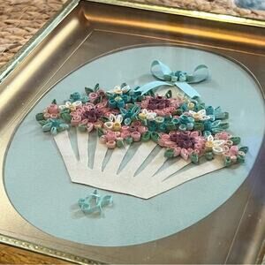 Vintage Quill Art Quilling Paper Swirl Basket of Flowers Gold Framed Handmade