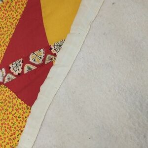 Vintage handmade quilt. Mid century style material used. Seems like more of a twin size, but could possibly work for a full size. Used, and still nice condition. There's only one place that I can see where the stitching is apart and it's 2nd picture. Overall nice and unique! Thanks for looking.