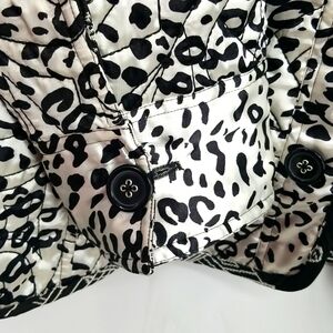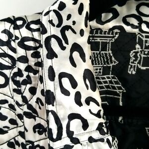 Stunning Quilted Reversible Lagenlook Duster Cardigan Kimono Art-to-Wear Jacket in Silky Quilted Fabric On One Side & Matte Fabric with (Hand?) Stitched Design On the Other. One Side Is A Scene of a Village While The Reverse Side Has Circles or Leopard-ish Print. Very Well Made. Probably Vintage & There Are No Tags For Brand, Size or Fabric Info. Please See Measurements. The Only Minor Issue I Found Is Slight Discoloration At the Front Collar. Very Faint. See Pics. It Fits A Cozy OverSized, Large, possibly XL. No Tag- See Measurements. Beautiful Silvery White and Black Colors On Both Sides. Versatile and Gorgeous!