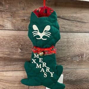 Vintage Quilted Cat Christmas Holiday Stocking Door Hanger Decor Green Red White