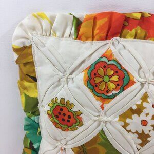Vintage Quilted Couch Sofa Pillow Home Decor Orange Teal White Floral Ruffle 13"