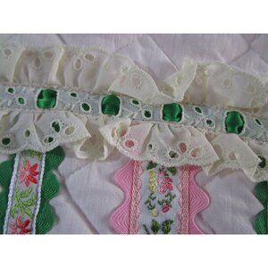 Deck the halls and hearth with this quilted beauty. A delightful mix of pink, green, and ruffles that's practically begging for Santa's attention. Beautiful embroidered ribbon with green and pink ric rac accent. Eyelet lace with green grosgrain ribbon. Green grosgrain ribbon hanging loop. Pink gingham lining. No tags or labels