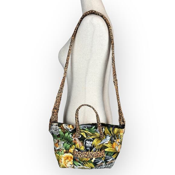 Vintage Quilted Mini Tote Bag Featuring a Jungle Animal Print with Leopards Lions Gorillas Zebras And Tropical Foliage Throughout. Structured Quilted Body With Top Zip Closure, Dual Carry Handles, Crossbody or Shoulder Strap. Quilted Fabric Construction, Two Inner Pockets, One Outer Pocket.